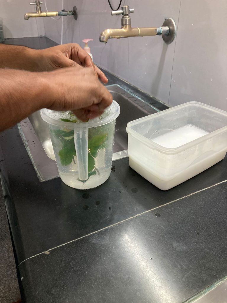 Green Ahalia has been working on ex situ conservation of two threatened tree species Syzygium palghatensis a Critically Endangered species and Elaeocarpus gadgilii reported from Nelliyampathy recently. We could locate the species in wild and to our dismay no regeneration is observed. We are engaged in vegetative propagation trials using branch cuttings which gave good sprouting but not rooting. To ascertain the influence of the season, we are repeating the trials every other month. Further to this Green Ahalia has been in touch with a Bangalore based Biotech company – Bangalore Horti Tech and sought their help to multiply the species using Tissue Culture technology. Sabik has visited them along with necessary Ex plants and attempted the propagation. Sri Nabas Khan MD of the company and Mr. Sahfeeq are liberally helping us in this venture. We are keeping our fingers crossed for positive results and there by saving the species for survival.