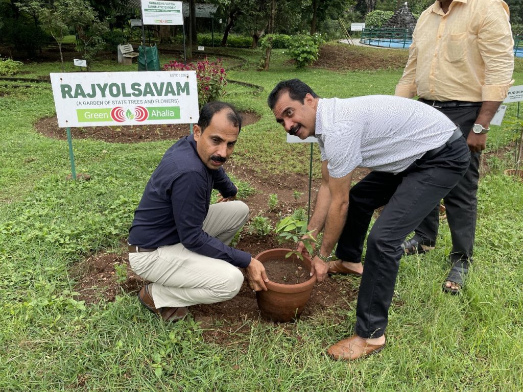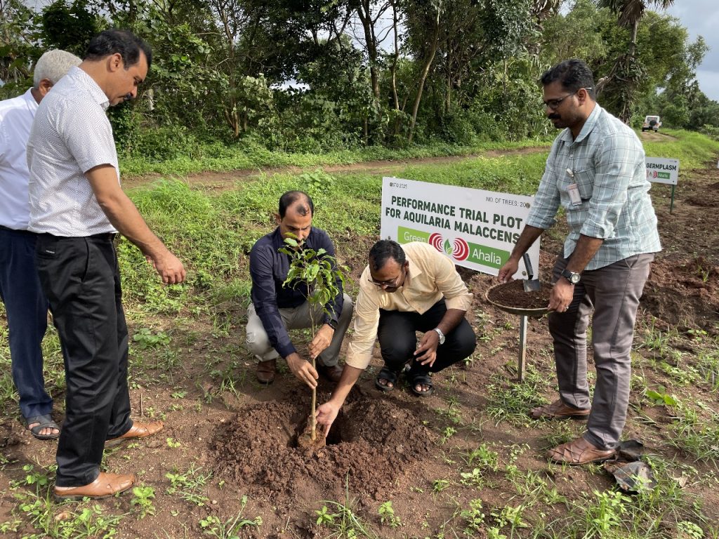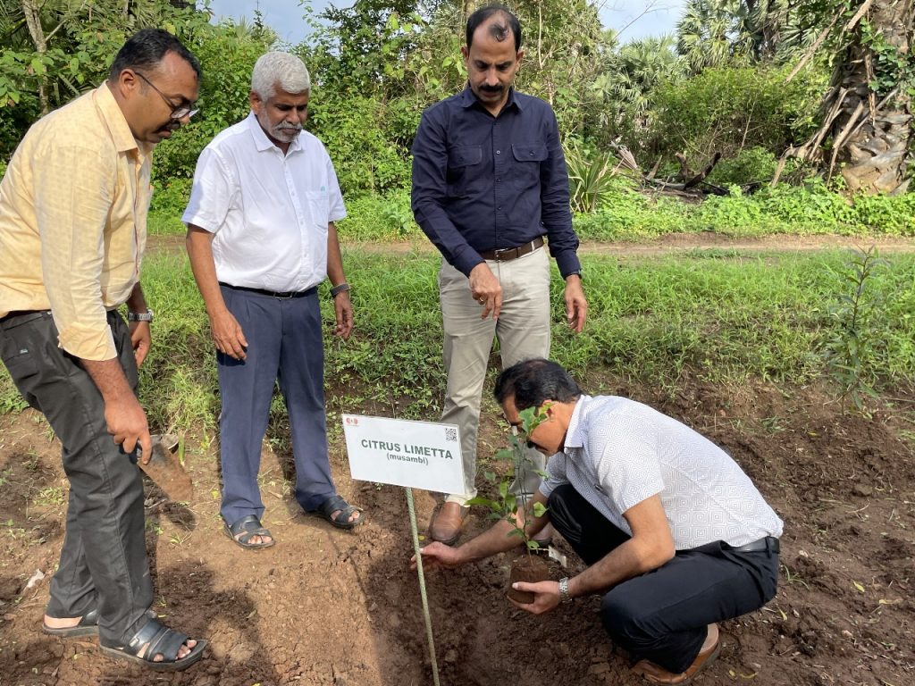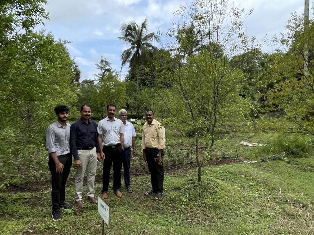 This was followed by a field visit to Green Ahalia theme gardens. We took the opportunity to take the visiting dignitaries to all our thematic gardens, Cultivation models, conservation and demonstration plots. Dr. Balakrishnan Inaugurated our Rajyolsavam –The State Trees and Flowers Garden.” where state trees and state flowers of different states in the country are planted. He also inaugurated our new Citrus germplsm and Dr. Sujanapal inaugurated our performance trial plot of Oodh (Agar/ Aquilaria malaccensis). The Heritage museum, Sculpture garden etc were also shown to the visitors. We had fruitful discussion on mutual collaboration and to take forward the ideas. The member Secretary, KSBB planted a sapling of Persea macrantha in the Smrithi Vatika. The visitors left the campus much satisfied.