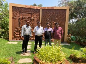 On 28th March two Green Ahalia team members Mr. Shaibu and Mr. Sabik again called on Professor Sabu (who is also our Advisory Board member) at MBGIPS (Malabar Botanic Garden and Institute of Plant Sciences), Calicut along with Dr. Hareesh Scientist there and spent some quality time discussing about garden development. We had a quick round of their garden and saw the recent additions to the features of the garden aimed at improved amenities and attractions for visitors. We could see very interesting features added to the garden through sculptures, water fountains, water falls, streams, rockery and garden displays etc. The glass walls in their green net houses are innovation convenient to the visitors for clear view of displayed plants. These of course have fund and technological inputs. We delivered to them palm seedlings taken from our garden. Prof. Sabu gave us two of his valuable publications as gift.