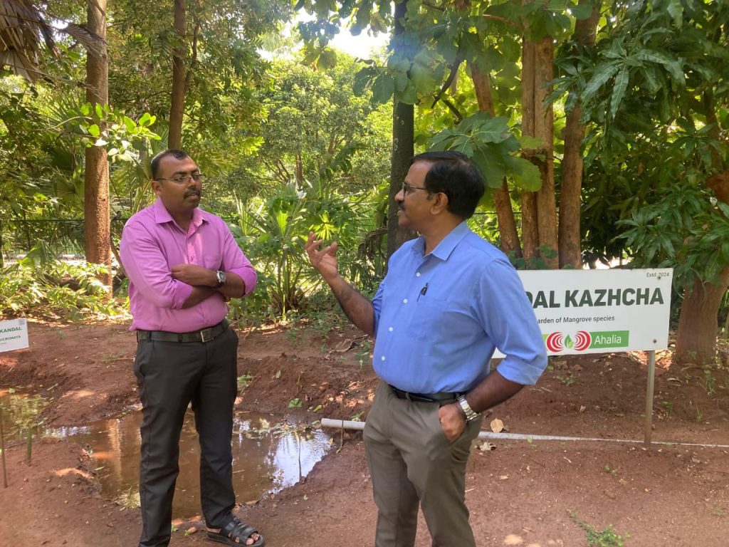As part of the carbon auditing process, Haritha Keralam Mission state officials and Palakkad district officials visited Ahalia on October 6, 2025. The team was led by Mr. Sanjeev, Assistant Coordinator, Haritha Keralam Mission. The officials were taken around various areas of the campus and shown the campus greenery, solar power plant, wind power plant, Green Ahalia thematic gardens, cultivation models, and other initiatives. Green Ahalia team members Shaibu and Sabik along with Net Zero team conducted the campus tour to the visiting team. After the field visit, a meeting was held with the members, and their suggestions were noted. The officials appreciated Ahalia’s efforts toward environmental conservation.