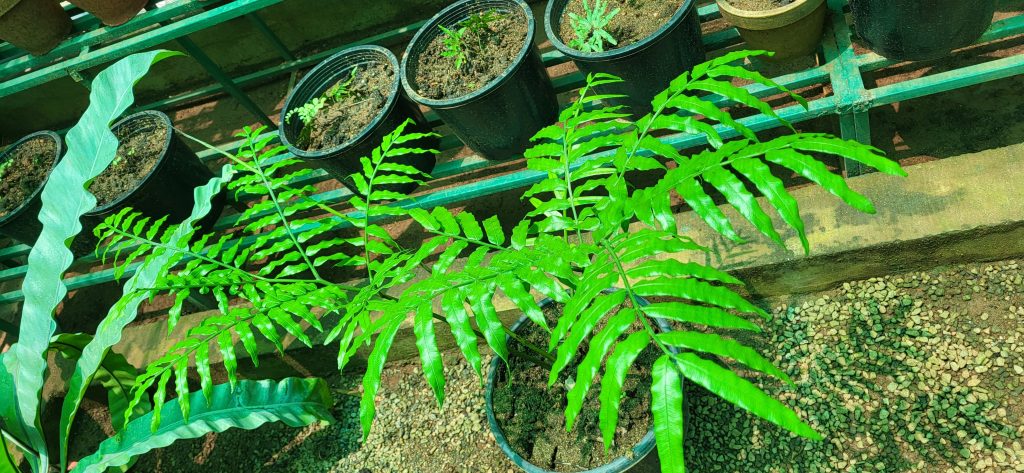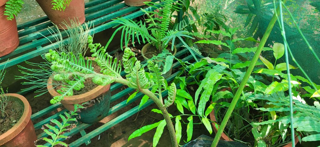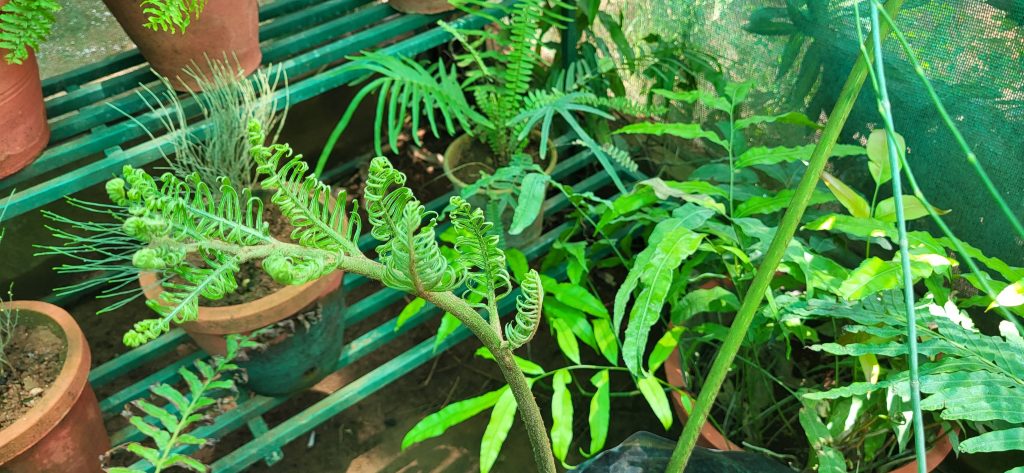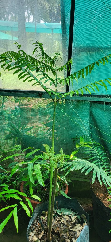 Angiopteris helferiana C.Presl is a primitive, large tropical fern belonging to the ancient fern family Marattiaceae. It is known for its large size of fronds and is considered a relict species. Often found in moist, shaded forest regions, particularly along stream banks in tropical and subtropical forests. The plants are featured by stout, short and tuberous erect rhizome. Often covered with scars from fallen fronds. Fronds very large, reaching 3–6 m in length, bipinnate with a stout, thick grooved petiole. These plants are considered rare and Threatened due to habitat destruction. Green Ahalia has initiated ex –situ conservation of this rare plant and is growing well in our Fern house.