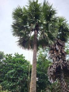 Borassus flabellifer L. commonly known as the Karimpana (M), Palmyra palm or Toddy palm (E) is a tall and robust palm species. These dioecious palm tree is one of the star plant as per the Hindu mythology (Uthrattathi) and is further cited in Hortus Malabaricus by Van Rheede (Vol. I). They are further characterized by simple, palmate or plicately multifid leaves, spadices inter – foliar, large, dioecious and branched; peduncle sheathed with open spathes. Male flowers small, clustered; bracts scaly, sepals 3, petals 3, stamens 6. Female flowers large, globose. Perianth fleshy, accrescent. Sepals reniform, imbricate. Petals smaller, convolute. Ovary globose, entire or 3-or-1-cleft, Fruits a drupe, globose, yellow when ripe, with 1-3 compressed pyrenes.