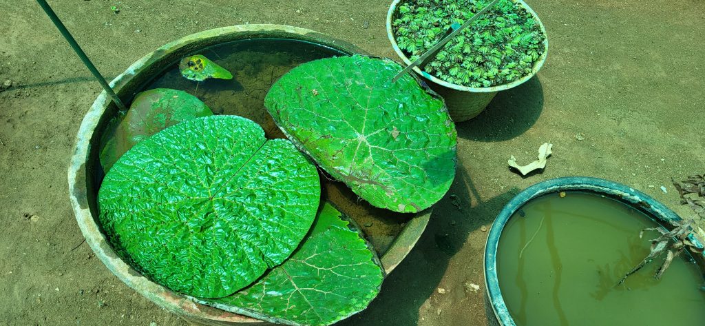 Euryale ferox Salisb, commonly known as Prickly Water Lily or Makhana, is a perennial aquatic plant valued for its fox nuts or Makhana that are used for various purposes, including food, medicine, and other traditional practices. The seeds are often roasted or fried and are eaten by the community. These plants are characterized by the presence of sharp spines present on the stems, leaves, and even on the flower sepals. Leaves large, round, and peltate (ca. 30-120 x 25-110 cm).