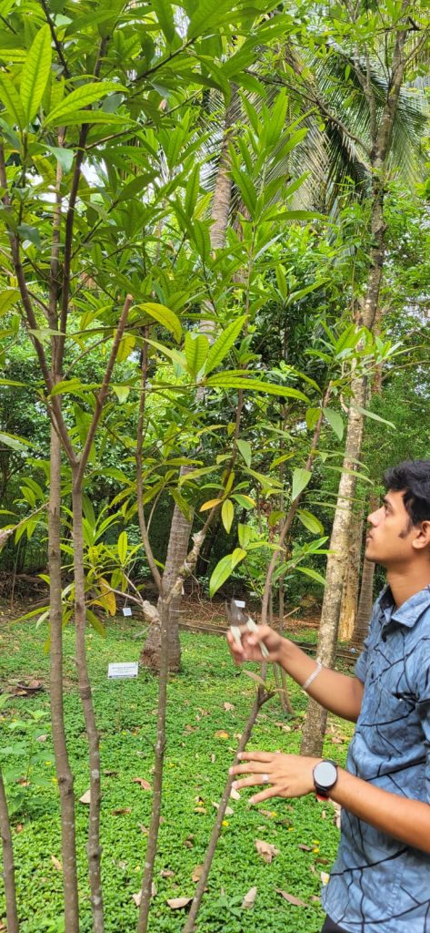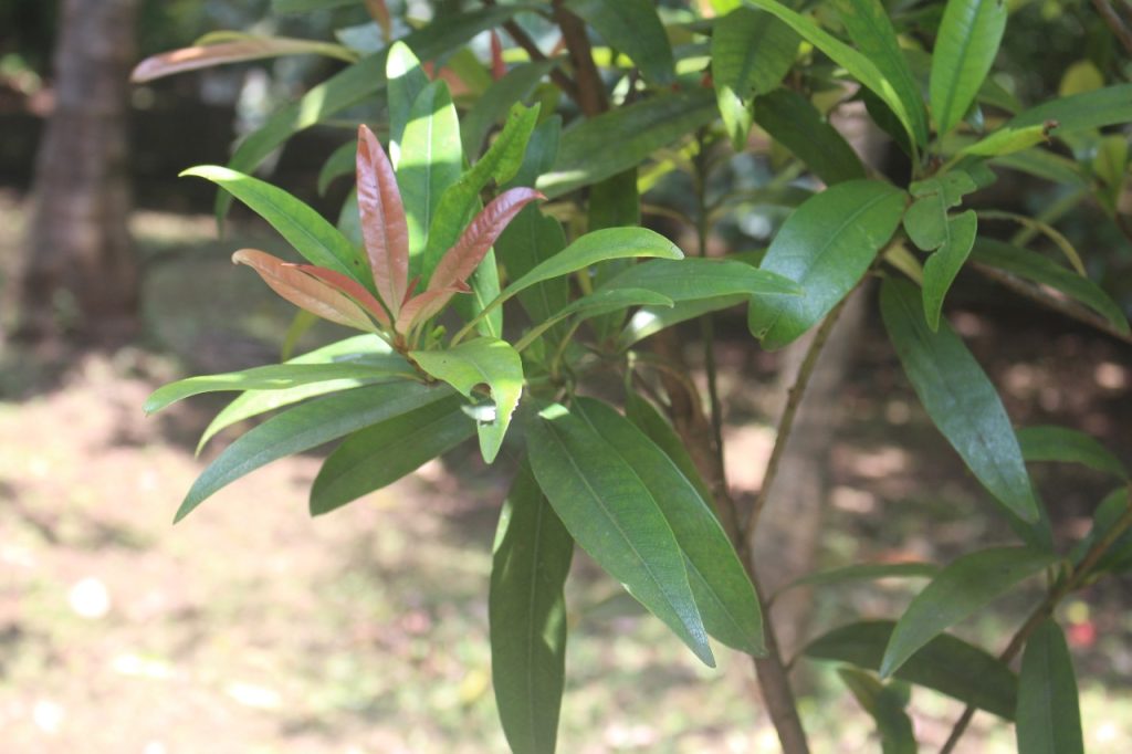 Madhuca insignis (Radlk.) H.J. Lam (commonly known as Kavilippa) is a medium-sized tree that grows in moist deciduous to semi-evergreen forests belongs to family Sapotaceae and looks somewhat similar to M. nerifolia…….. This species is endemic to Southern Western Ghats. The plant is characterised by simple alternate leaves, elliptic – oblong with entire margins which are often clustered at branch tips. Flowers small, creamy white, bisexual in fascicles and fragrant. Fruit a fleshy berry. This plant was once declared extinct due to habitat loss and fragmentation. Thankfully, Madhuca insignis population has been rediscovered along the banks of the river Kumaradhara, in Dakshina Kannada region of Karnataka state, India. In a conservation perspective the plant is considered Critically Endangered (CR). Green Ahalia has introduced this species in the RET garden – Sanketham and efforts to multiply it through vegetative means are on.