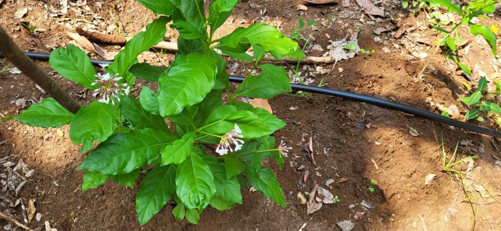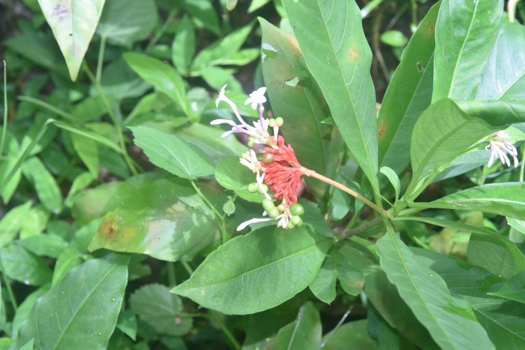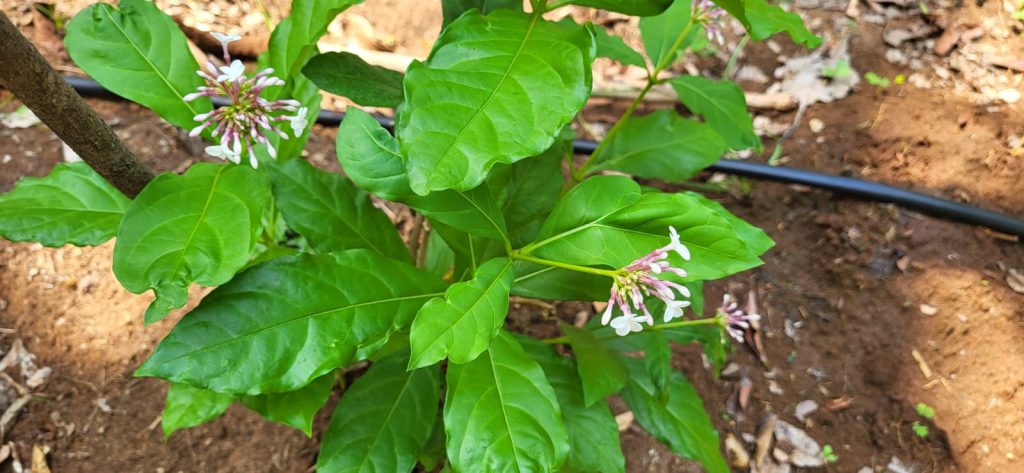 leaves towards the tip, Flowers appear densely in terminal cymes with reddish peduncles.Corolla tube purplish pink with white lobes. Fruit ovoid drupe. It turns from green to red and finally black when ripe. This rather rare plant is used in Indian systems of medicine for centuries to treat a wide variety of diseases including snake and insect bites, malaria, abdominal pain, and dysentery. It was also used in high BP treatment of fever and urinary infections. Green Ahalia, knowing the rarity and medicinal value of this plant, is trying to conserve and protect this plant.